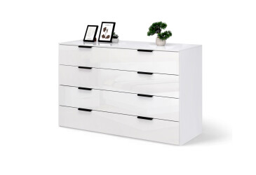 - novinka, dřevotříska, laminovaná, lesklá, se zásuvkami, bílý lesk, kuličková vedení plného výsuvu, 4 zásuvky, dřevotříska.