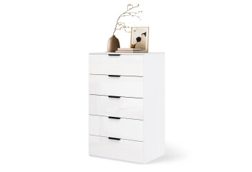 - novinka, dřevotříska, laminovaná, lesklá, se zásuvkami, bílý lesk, kuličková vedení plného výsuvu, 5 zásuvek, dřevotříska.