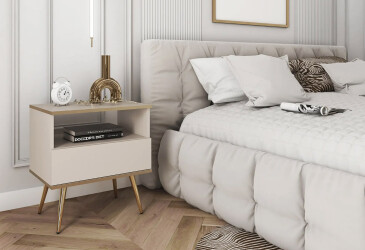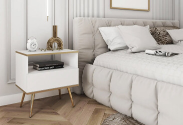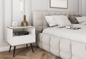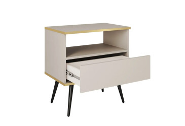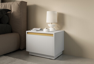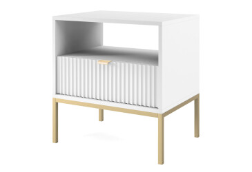 - super-cena, MDF, matná, zlatý / bílý, volně stojící, kuličková vedení plného výsuvu, s police a zásuvky, dřevotříska, skandinávský styl.