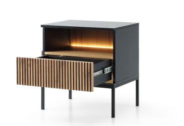 - super-cena, MDF, dodáváno s osvětlením, laminovaná, černý / dub wotan, volně stojící, kuličková vedení plného výsuvu, s police a zásuvky, dřevotříska, moderní styl.