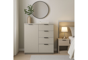 - speciální nabídka, skladem, dřevotříska, laminovaná, s dvířky, kašmír, kuličková vedení plného výsuvu, 4 zásuvky, dřevotříska, moderní styl.