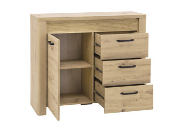 - super-cena, dřevotříska + MDF, laminovaná, patinovaná, s dvířky, dub navarra, kuličková vedení plného výsuvu, 3 zásuvky, dřevotříska, moderní styl.