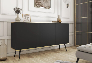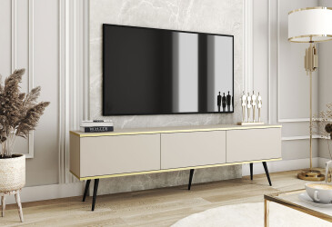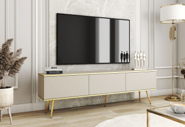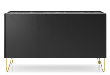 - super-cena, MDF, matná, zlatý / šedý, volně stojící, kuličková vedení plného výsuvu, dřevotříska, s policemi, se zásuvkami, s dvířky, skandinávský styl.