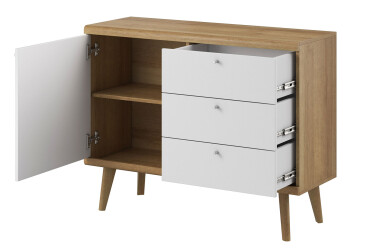 - super-cena, dřevotříska, laminovaná, s dvířky, dub riviéra / bílý, kuličková vedení plného výsuvu, 3 zásuvky, dřevotříska, skandinávský styl.