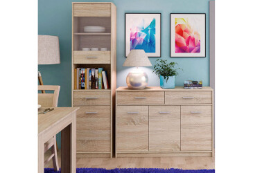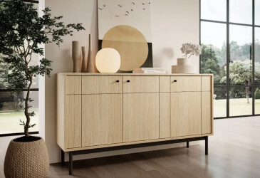 - super-cena, frézovaný DSP, laminovaná, dub linea, volně stojící, kuličková vedení s dotahovačem, dřevotříska, s policemi, se zásuvkami, s dvířky, moderní styl.