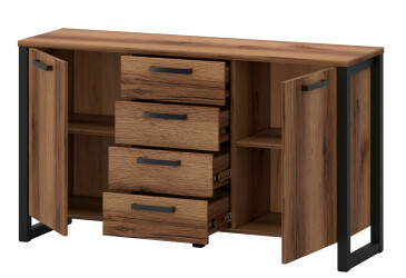 - super-cena, MDF, laminovaná, dub navarra / grafit, volně stojící, kuličková vedení plného výsuvu, dřevotříska, s policemi, se zásuvkami, s dvířky, loft.
