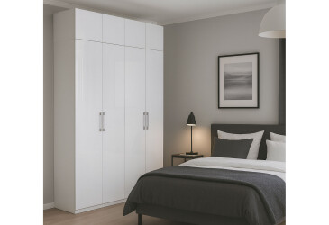- super-cena, sklo, možnost osvětlení polic, laminovaná, bílá, dřevotříska, police, tyč, moderní styl.