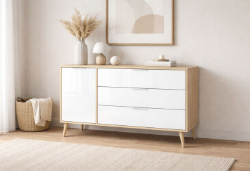 - super-cena, dřevotříska, laminovaná, s dvířky, eukalyptus / skandinávský smrk, kuličková vedení plného výsuvu, 3 zásuvky, dřevotříska, skandinávský styl.