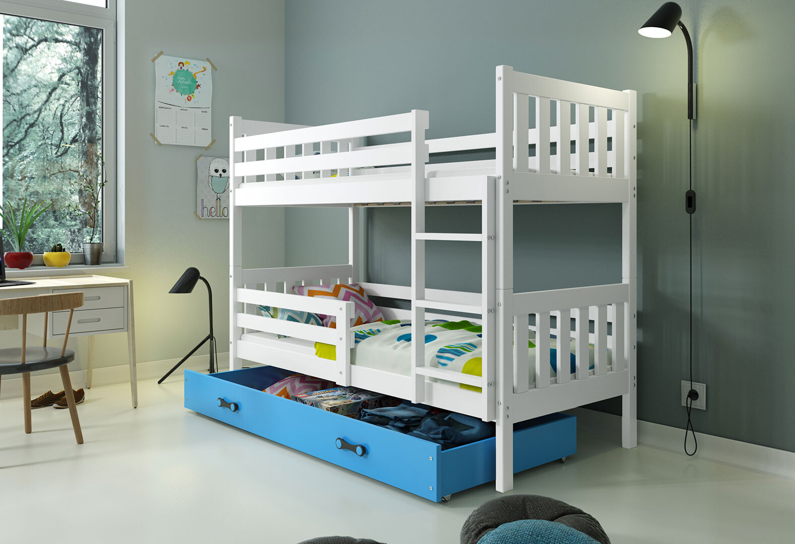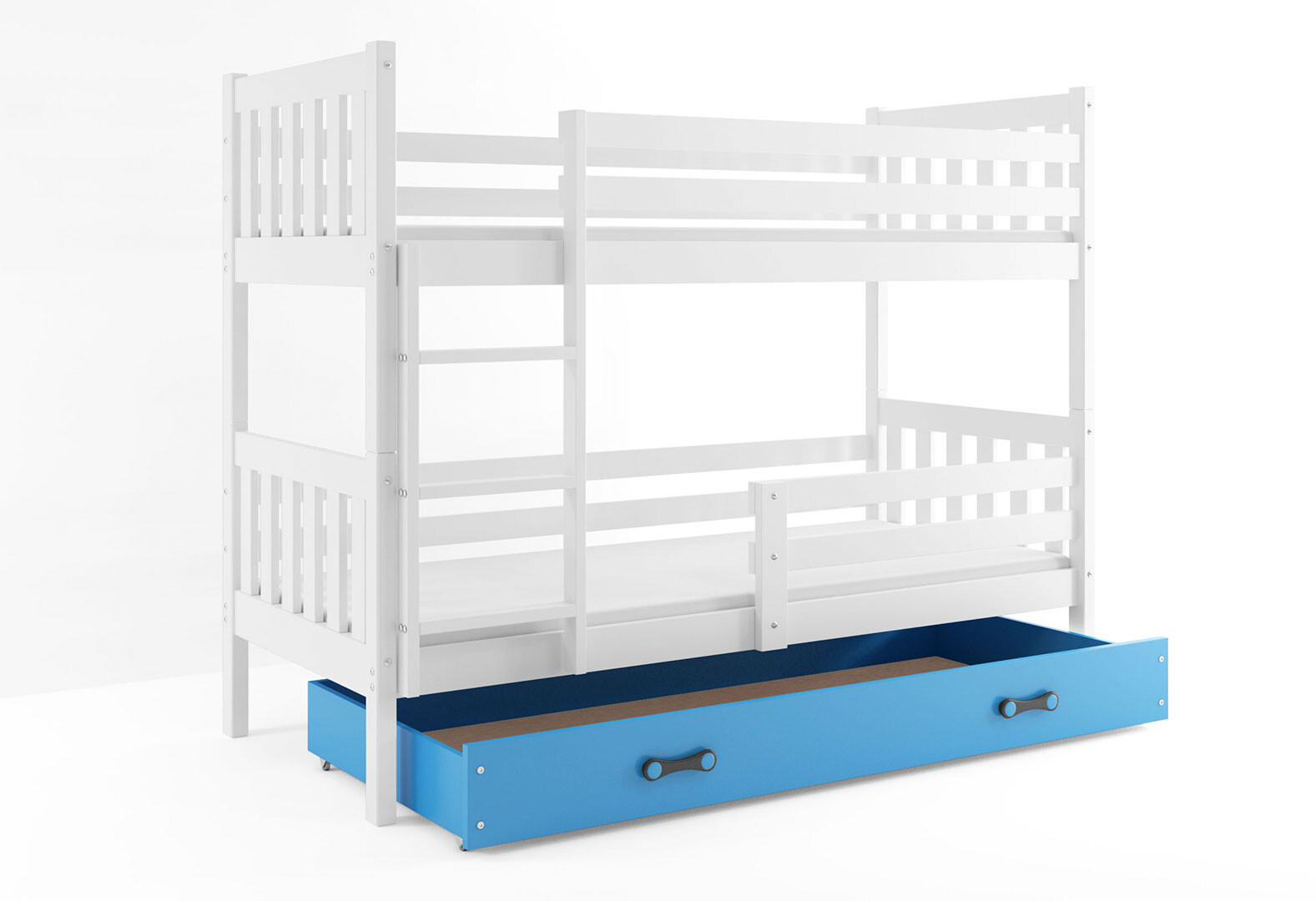 Fotografie 1 - Patrová postel Carino bílé, zásuvka modrý 80x160 cm s roštem, matrací