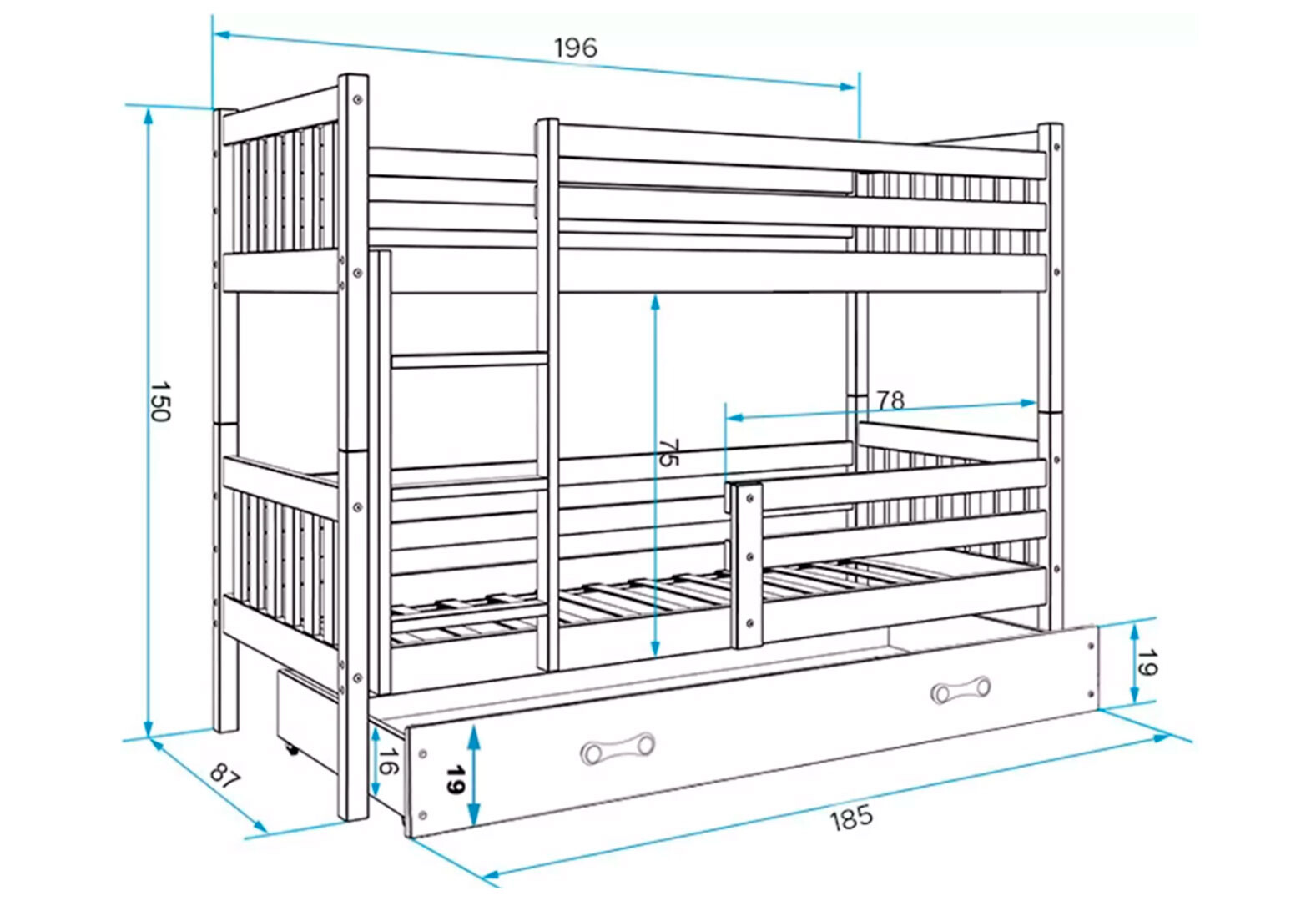 Fotografie 3 - Patrová postel Carino grafit, zásuvka grafit 80x190 cm s roštem, matrací