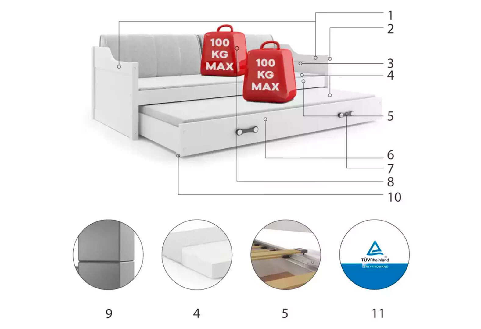 Fotografie 4 - Dvoulůžko Dawid bílý / zelený 90x200 cm s roštem, 2 matracemi