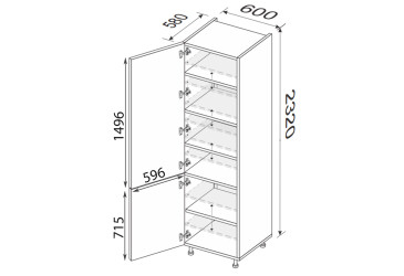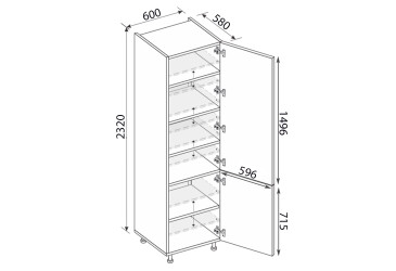 - Velikost. Šířka 60 cm, výška 232 cm a hloubka 58 cm zajišťují dostatečný prostor pro uložení potravin, nádobí a dalších kuchyňských potřeb, což vám pomůže udržet vaši kuchyň v pořádku a organizaci.