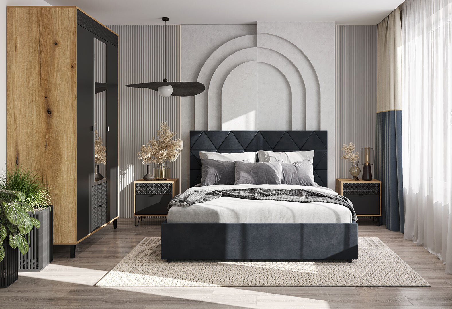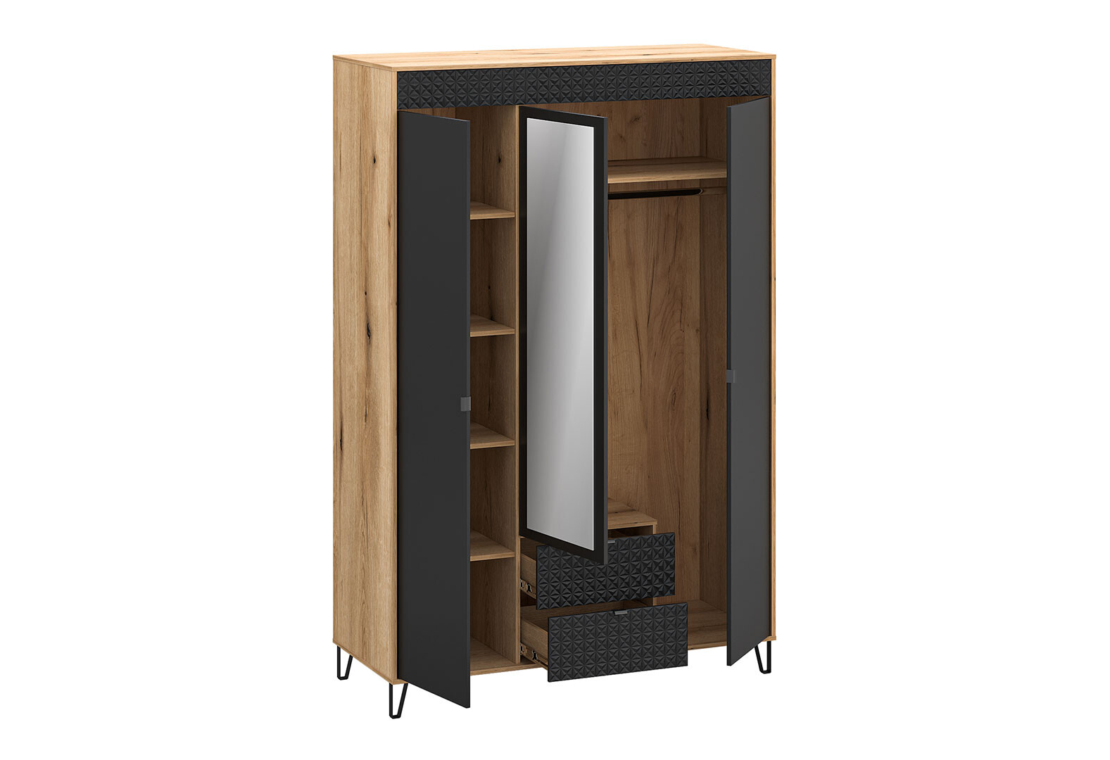- Skříň třídveřová se zrcadlem a zásuvkami Bellano 145x200x56 cm Dub evoke / Černá