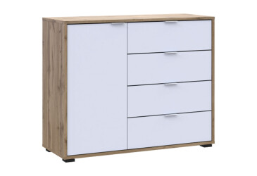 - super-cena, skladem, dřevotříska, laminovaná, s dvířky, dub taho / bílý, kuličková vedení plného výsuvu, 4 zásuvky, dřevotříska, moderní styl.