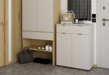- speciální nabídka, skladem, dřevotříska, laminovaná, s dvířky, bílá / dub kamenný, kuličková vedení plného výsuvu, 3 zásuvky, dřevotříska, skandinávský styl.