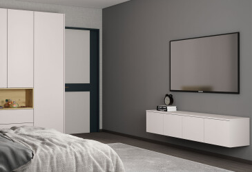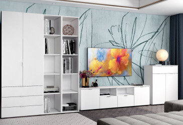 - speciální nabídka, skladem, MDF, možnost osvětlení, matná, bílá, volně stojící, dřevotříska, s policemi, se zásuvkami, s dvířky, skandinávský styl.