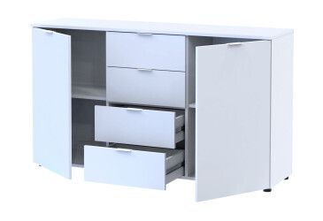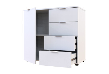 - super-cena, skladem, dřevotříska, laminovaná, s dvířky, bílá, kuličková vedení plného výsuvu, 4 zásuvky, dřevotříska, moderní styl.