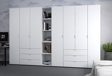 Skříň sedmidveřová s regálem Gelar 309 cm Bílá